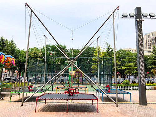 Bungee trampoline, also known as bungee jumping trampoline, it is a kind of sport & entertainment equipment and family amusement rides which is favored by children and adults. The 4 person bungee trampoline is composed of 4 jumping beds, 4 pair of elastic cords and several supporting columns. You can jump in the high altitude of 4 meters and make a variety cords and several supporting columns. You can jump in the high altitude of 4 meters and make a variety of in the high altitude of 4 meters movements. It’s a wonderful experience when playing the bungee jumping trampoline game.